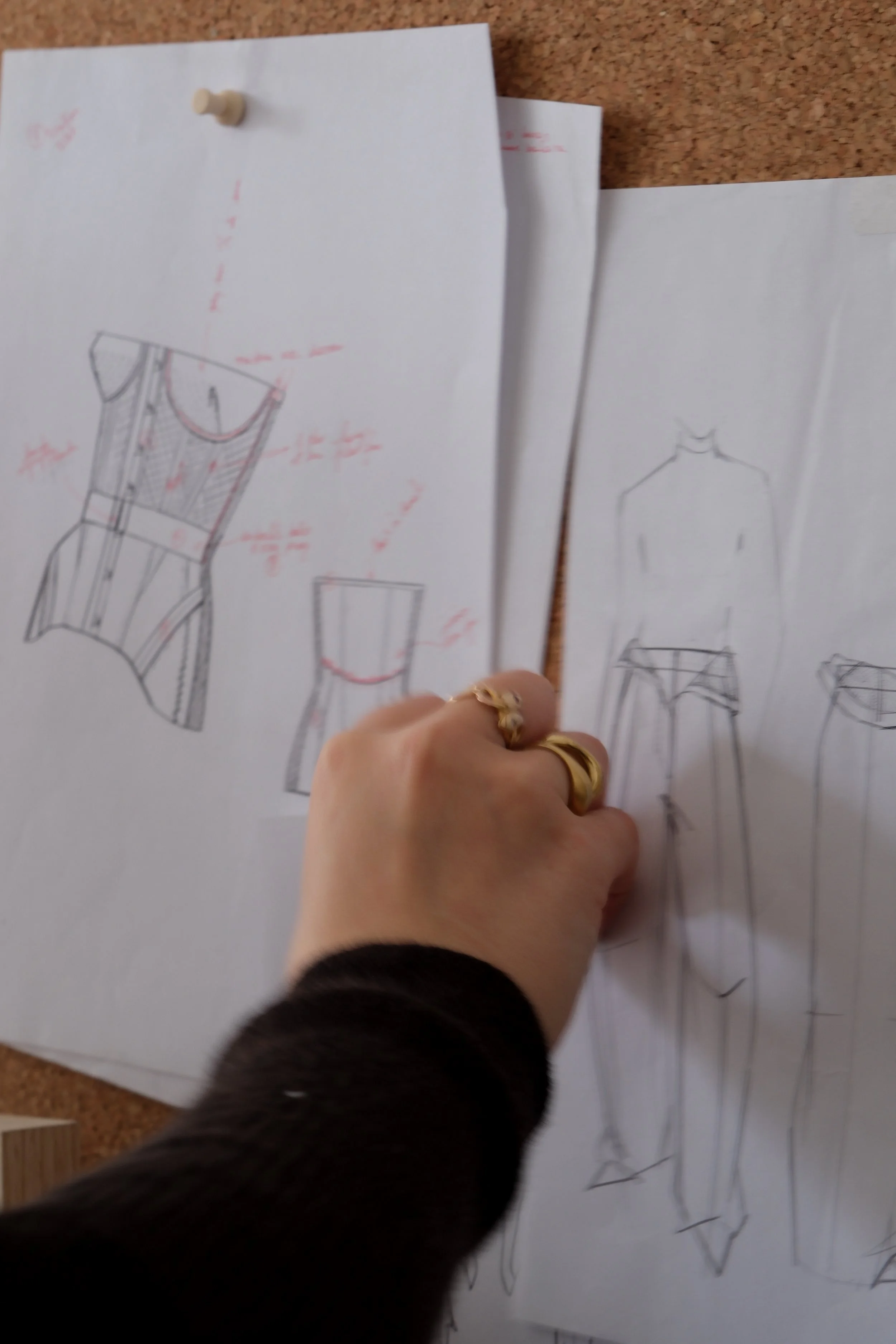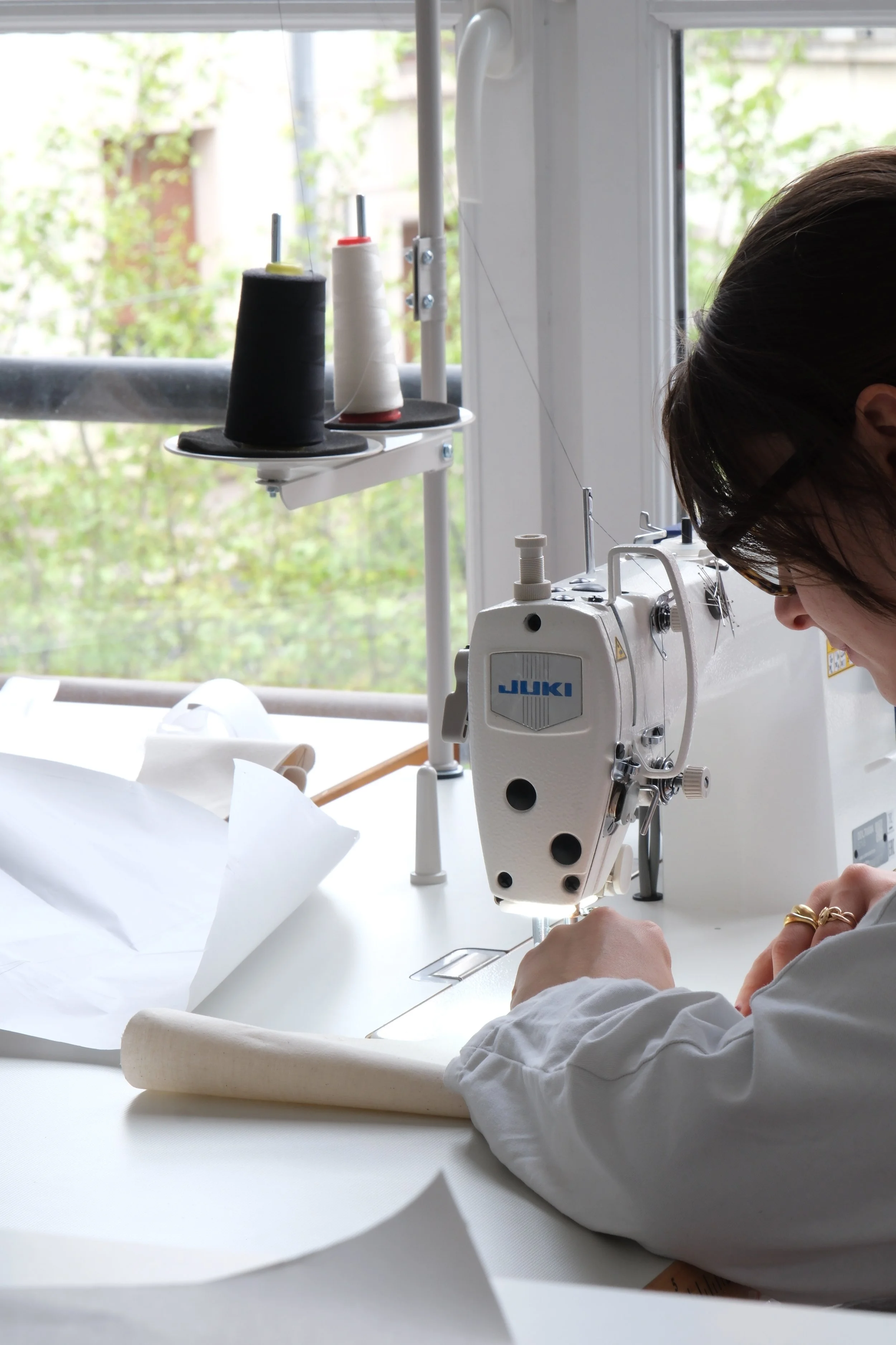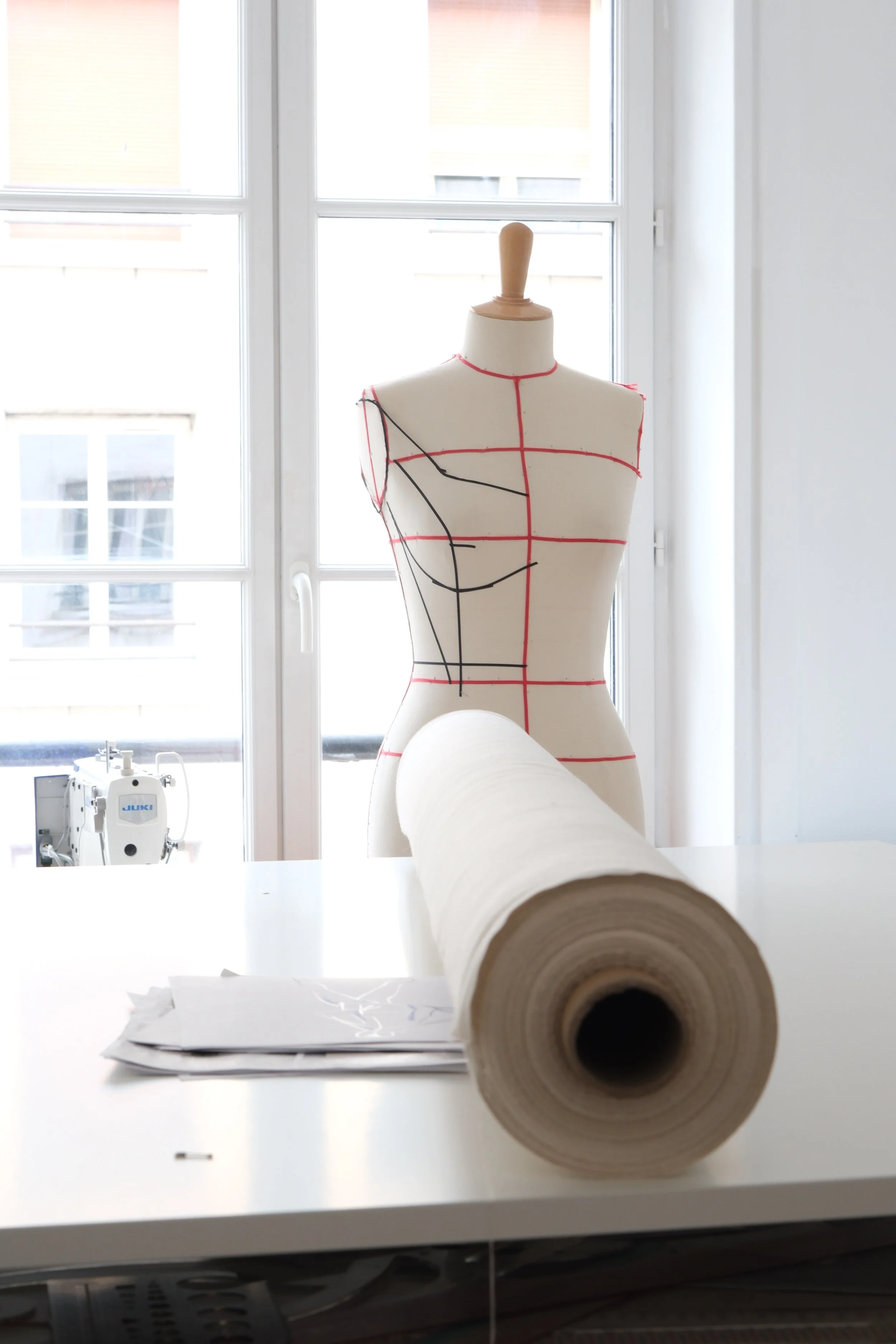 Vient ensuite la phase de modélisme, où Atelier Simone vous accompagne dans l’élaboration des patrons, la définition des volumes et les ajustements nécessaires.